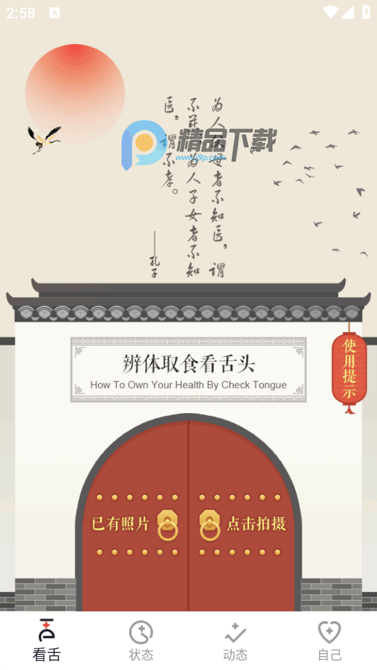 非常专业的一款拍照就可以根据舌头看病的工具,看舌头app是由武汉知医邦医院有限公司官方打造的正版自诊自疗应用,只需要拍照或者上传图片就可以轻松查看,通过建立 数字模型,更加便捷的分析舌头的颜色、形态、芒刺、裂纹等数据,并给出分析结果。