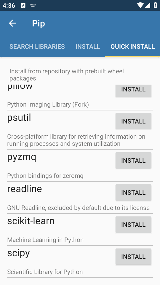 Pydroid存储库插件提供了一个带有预构建软件包的快速安装存储库,其中包含本机库。