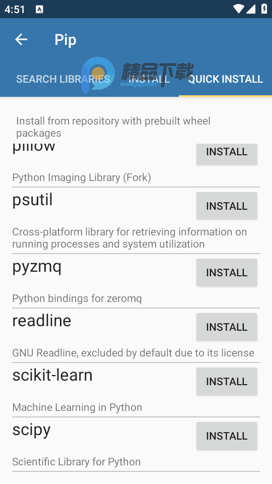安装使用Pydroid软件必不可少的本地库软件,Pydroid repository plugin又名pydroid3pip本地库,它是一个带有预构建的软件包,可以帮助用户快速安装存储库,包含了本地库,软件不能独立使用,需要搭配pydriod3操作,除非是程序要求,否则不要安装此应用,没有单独运行界面。