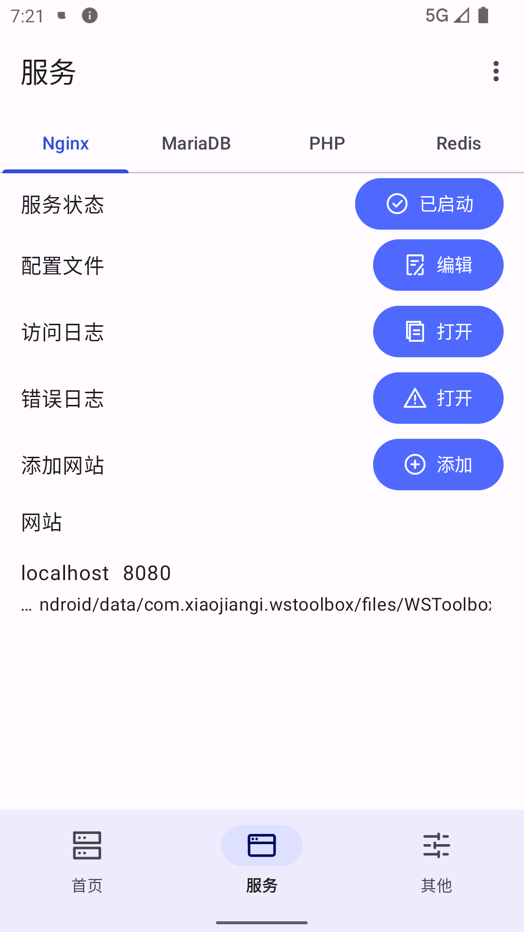 4、进入到【服务】界面,这里可以看到诸如Nginx、MariaDB、PHP、Redis的服务状态,可以编辑相应的配置文件,