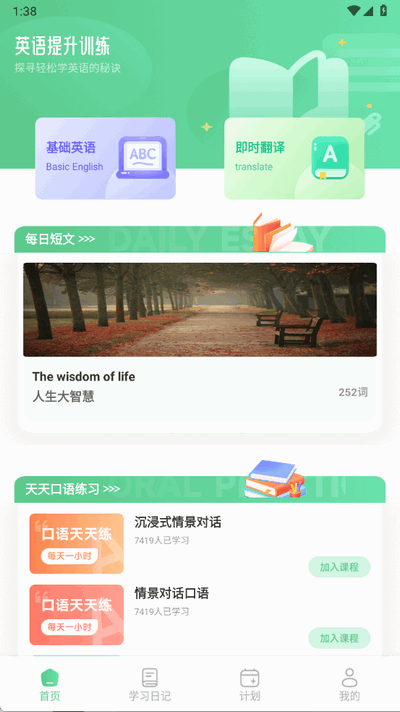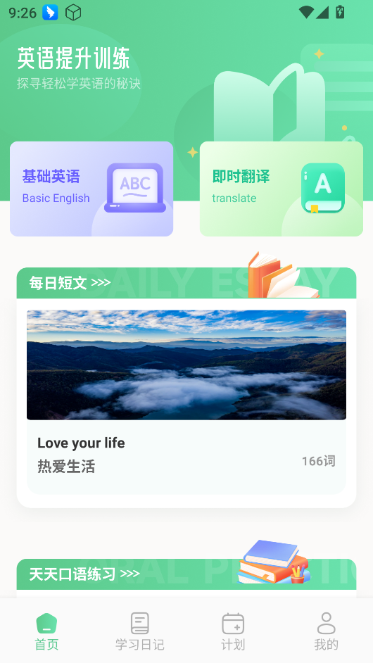 2、首页可进行基础英语学习,还能进行即时翻译、查看每日短文等。