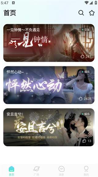 3、进入首页完善个人信息展现真实的自我,在一见钟情、怦然心动、安且吉兮多个板中找到自己的意中人吧。