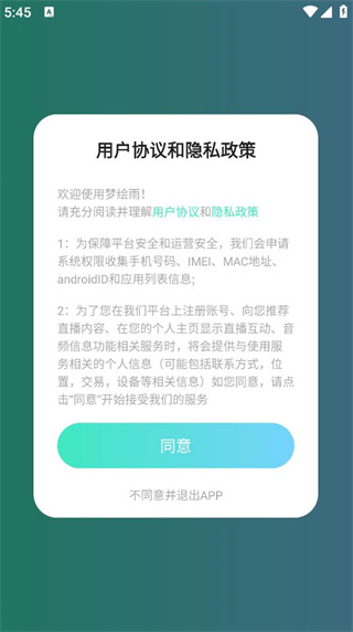 1、下载并安装梦绘雨app,仔细查看用户协议内容点击同意。