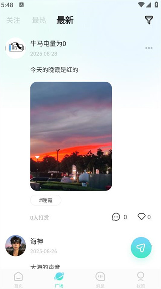 4、进入广场板块,这里汇聚了形形色色的用户,你可以浏览他们的动态,寻找感兴趣的话题或人物。