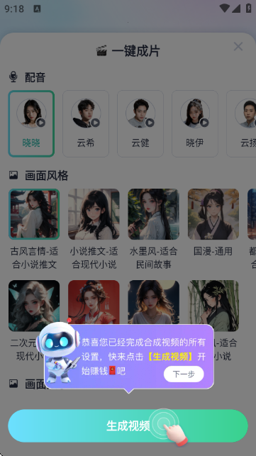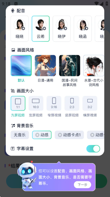5、当然想让作品更加完整,你还可以进行如图所示的创作,可以设置配音,画面风格,画面大小,背景音乐,以及是否需要字幕等。