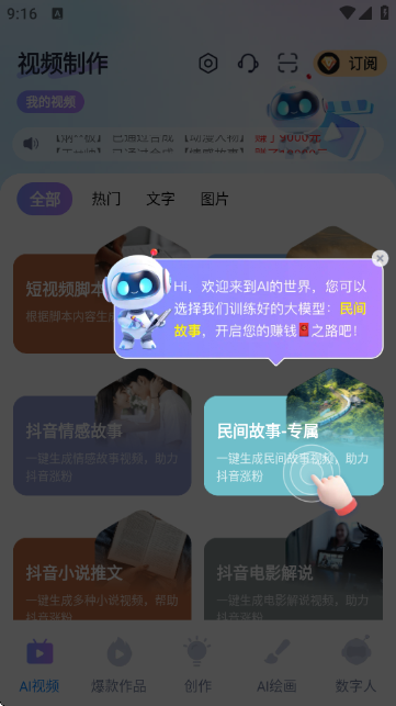3、进入到软件首页,如图所示;这里能为用户提供众多热门推荐和核心功能入口;【例如一键生成民间视频】