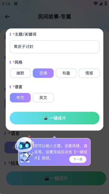 4、如图所示,输入主题和杆件次,风格,选择语言,最后点击【一件成片】,