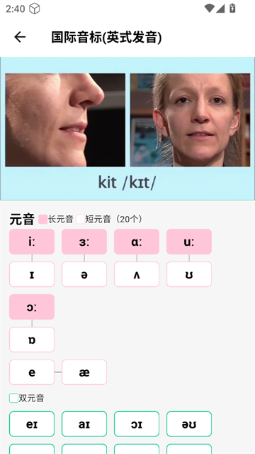 5、以英式发音为例,点击进入后点击相应音节即可查看发音视频。