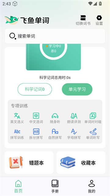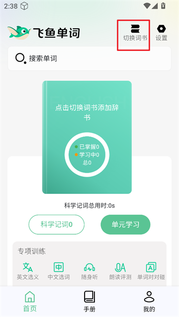 2、首页可选择词书进行单词学习,点击右上角可切换词书。