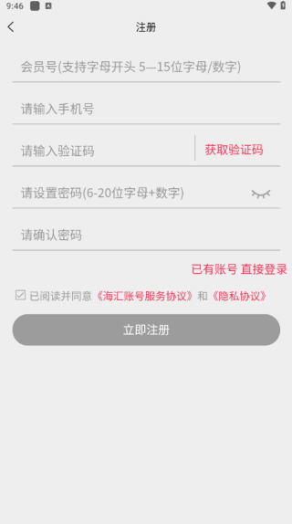 2、来到软件注册页面输入会员号、手机号、验证码、密码点击立即注册即可完成。
