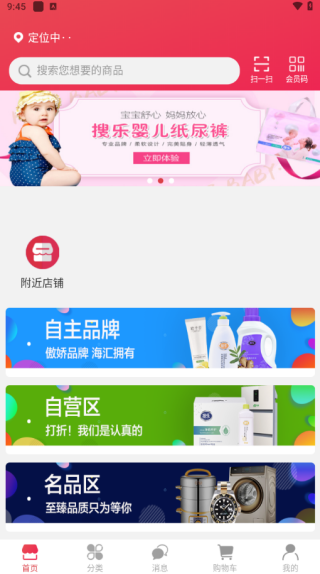 3、来到软件首页,可查看自主品牌,自营区、名品区等商品区。