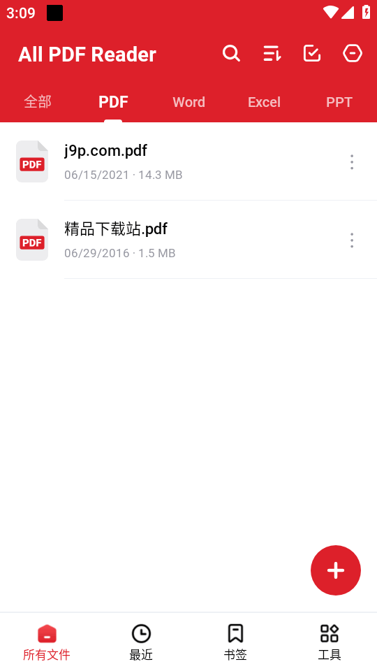 3、进入软件后,可以看到手机上的pdf文件,点+号也可以添加。