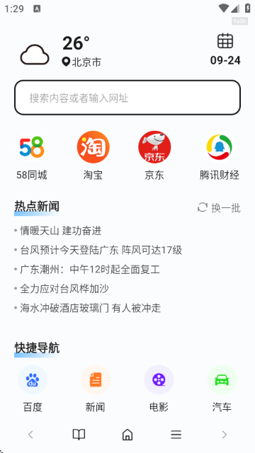 3、进入到软件首页,如图所示;这里能为用户提供众多热门网站标签入口;以及热点新闻和快捷导航。