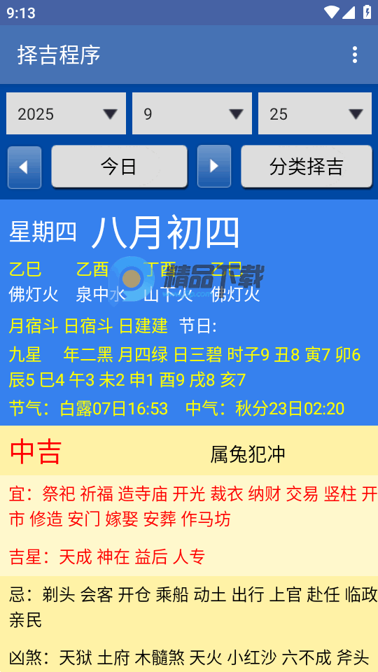 一款查询日常生活测吉凶的算命软件,该软件根据《协纪辨方》、《玉匣记》、《象吉备要》、洪潮和《择日讲义》等资料设计而成,可以以非常方便地查阅公元1882年-2060年任意一天的吉凶。同时软件里还有着意一天的当*吉神凶煞、每日吉凶宜忌、二十八宿、九星、节气、节日及纪念日,以及分类查询吉日、结婚吉日、阳宅竖造、阴宅安葬、时辰定局等内容。