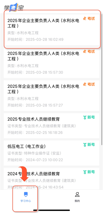 1、点击首页【学习中心】,点击对应考试,开始考试。