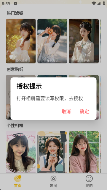 5、任意选择一种滤镜使用,然后根据提示授予软件必要的手机权限,然后就能正常使用该滤镜了。