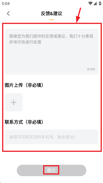 填写反馈&建议,图片,联系方式等内容,点击提交即可反馈意见