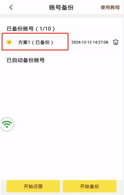 选择已备份好的方案,点击【开始恢复】按钮,完成对账号的的恢复。