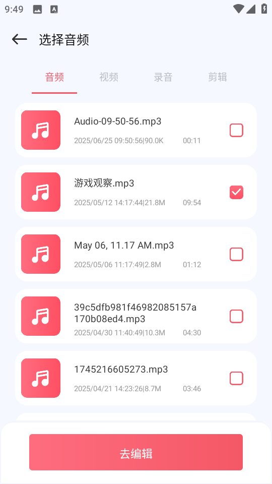4、再接着任意选择一个音频内容,点击“去编辑”。