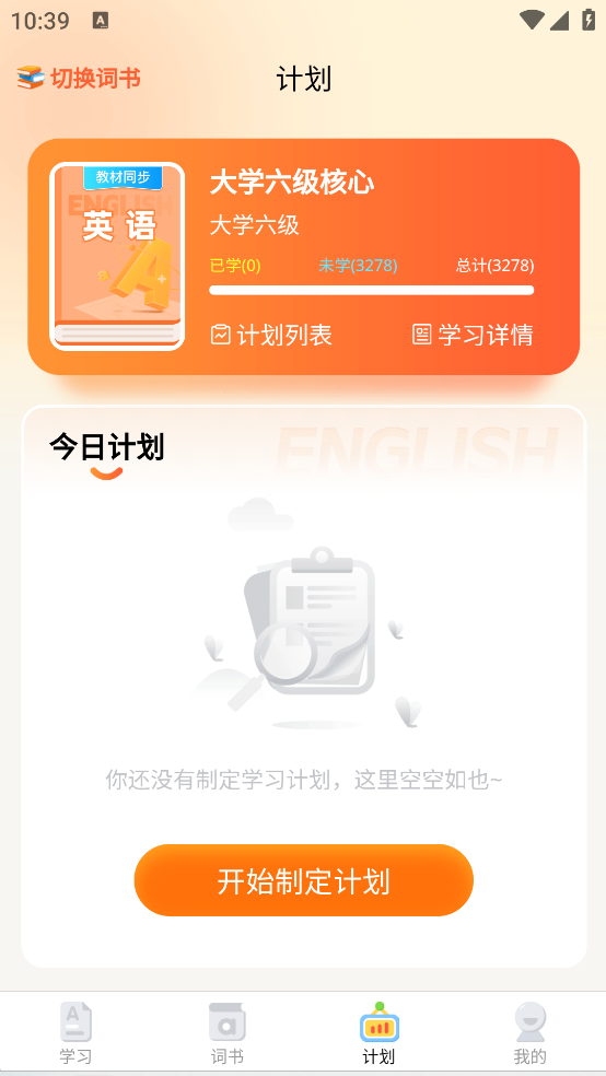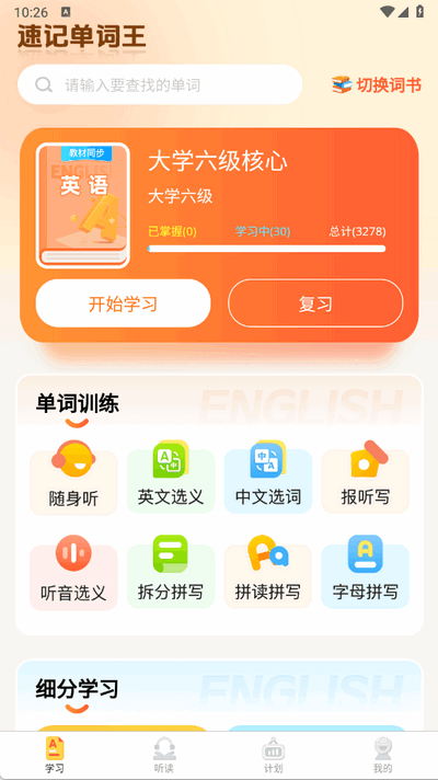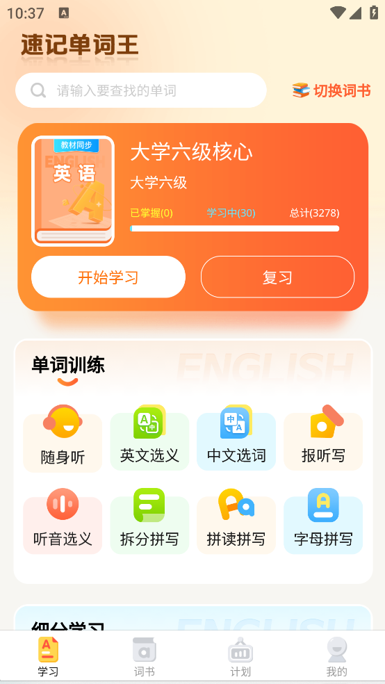 1、在学习页面中有关于不同内容的词书,同时进行单词训练、细分学习等操作;