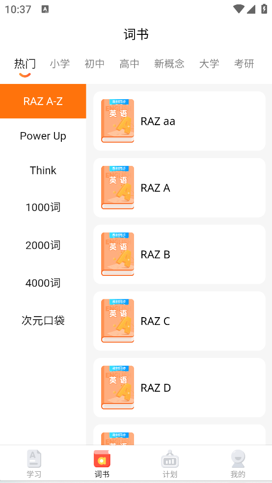 2、在词书里面包括了小学、初中、高中、新概念、大学以及考研的不同分类;