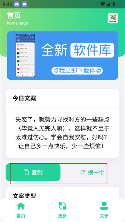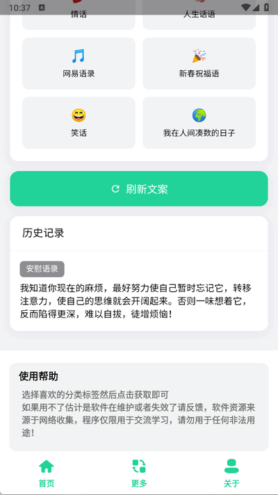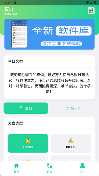 聚合文案库app不仅是一款工具,更是每一位文字工作者的得力助手。它用丰富的文案资源和智能化的推荐系统,为用户的创意之路铺平道路,让每一句话都充满力量。无论你是专业文案还是业余爱好者,文案库都能帮助你激发灵感,提升文案质量,让你的作品在众多信息中脱颖而出。
