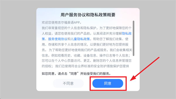 下载安装吉尔福英语app,先同意用户服务协议和隐私政策概要