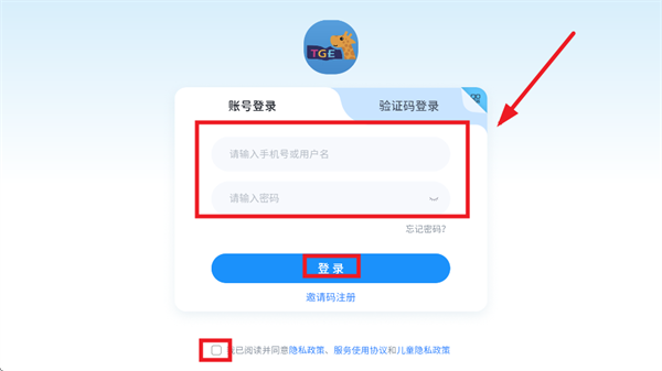 进入登录界面,在账号登录板块,输入手机号或用户名,密码,勾选我已阅读并同意隐私政策、服务使用协议和儿童隐私政策,点击登录即可