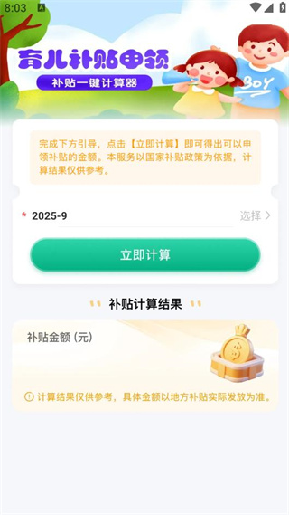 2、登录app,填写家庭基本信息,系统自动匹配全国范围内的育儿补贴政策,精准计算可申金额。