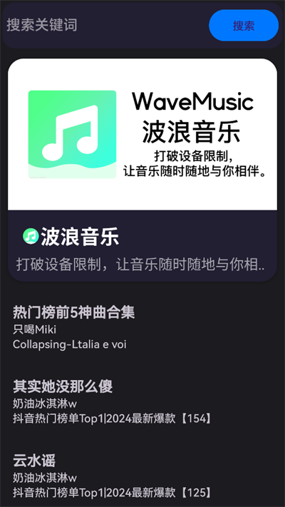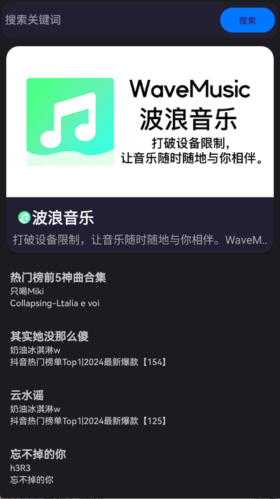 波浪音乐app是一款专注于跨设备音乐体验的应用,不仅在手机端可以使用,也可以安装在手表上使用,拥有海量曲库,可快速搜索喜爱歌曲,而且所有歌曲免费提供,让你快意的听音乐,感兴趣的用户快来下载吧。