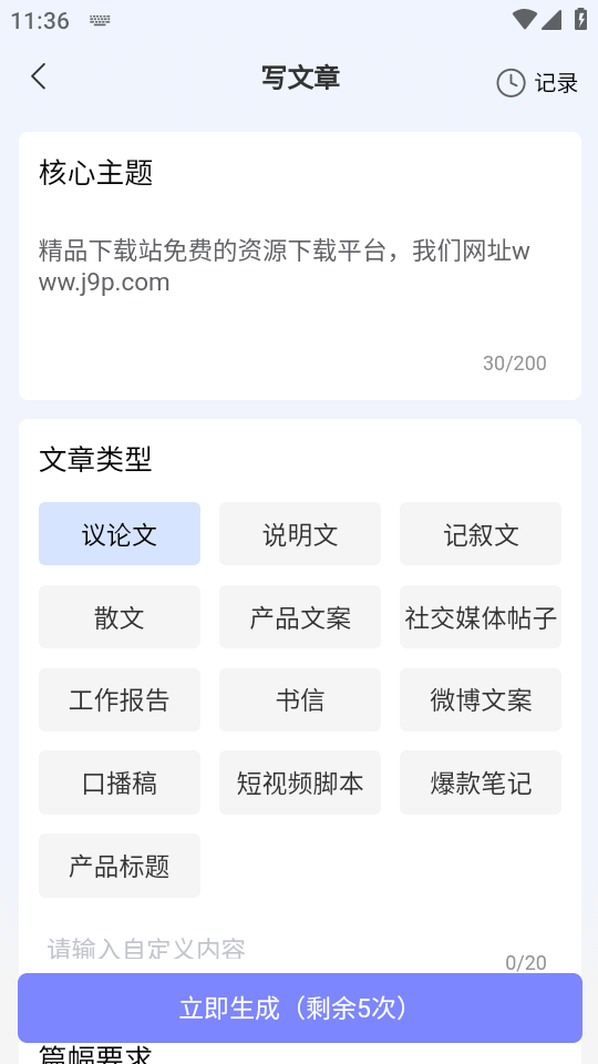 6、选择文章类型,篇幅要求,风格与语气然后点立即生成。