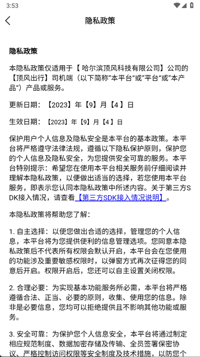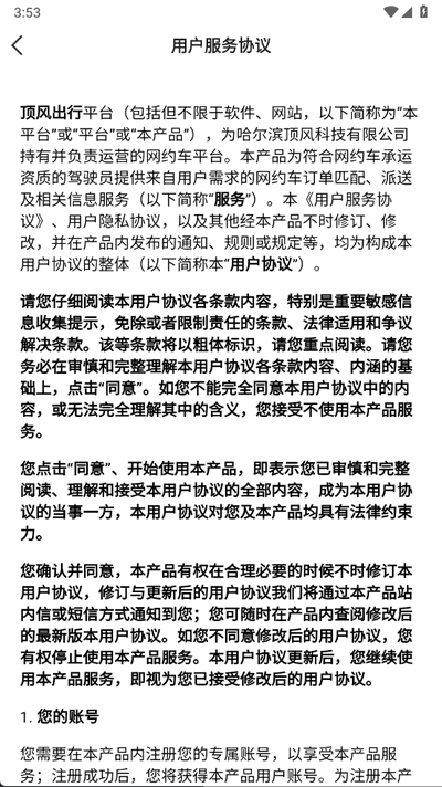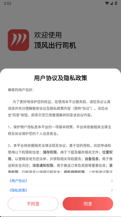 下载安装并打开顶风出行司机端app,先同意用户协议及隐私政策