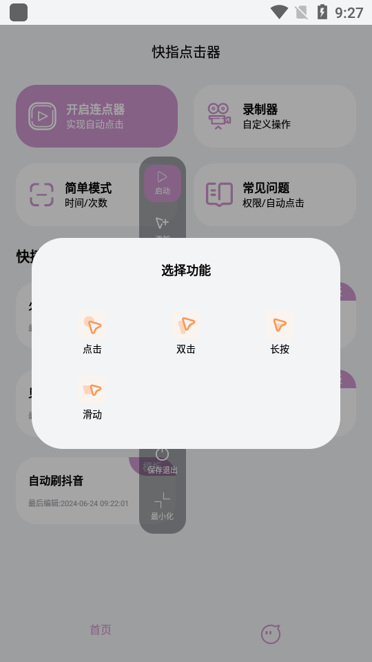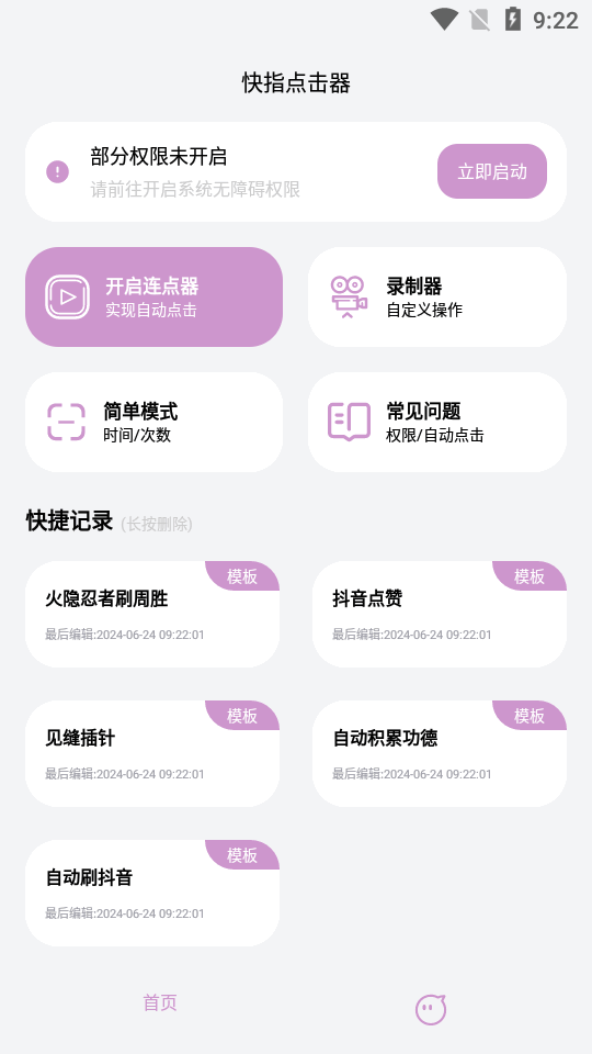 快指点击器是一款功能强大的手机点击工具,将自动点击、连点和手势操作集成于一体,让手机操作更加便捷高效。软件支持一键设置自动点击和连点操作,同时具备智能识别功能,能够自动识别用户设置的操作,无需手动选择。解锁会员版
