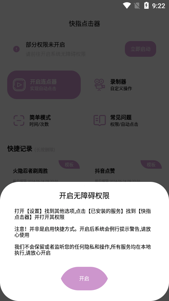 在安装完成后,首次打开快指点击器APP时,系统可能会提示需要开启无障碍服务。