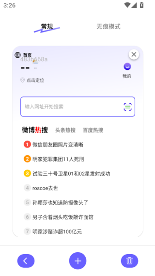 2、简洁易用的界面设计:首页设有搜索框以及微博热搜、头条热搜等模块,方便用户快速获取热点资讯;标签页可自由切换常规模式与无痕模式;点击“更多”还能进行多种网页设置。