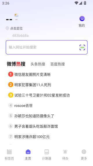 1、打开软件,进入首页,这里有搜索框,还有微博热搜以及头条热搜。
