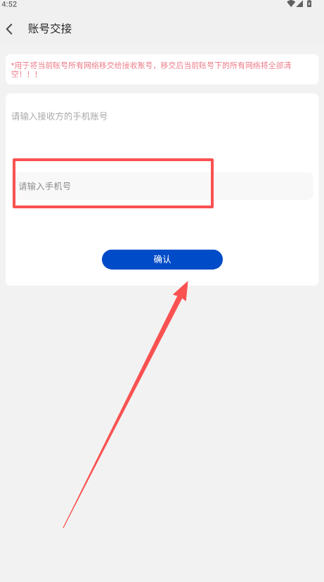 3、输入对方用于交接的手机号码,用于将当前账号所有网络移交给接收账号,移交后当前账号下的所有网络将全部清空。