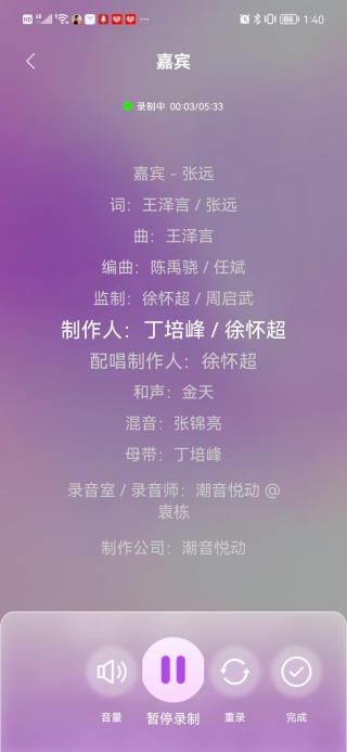 3、录制时歌词实时滚动提示,演唱结束点击"完成"结束录制。