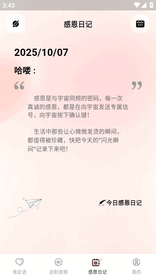 现在很多人都负能量太多,可以试试这款I own显化app,每天都有肯定语为你提供正能量,支持自定义肯定语,拥有感恩日记和定制专属肯定音频,只需要轻松的操作即可还你一个正能量满满的生活,界面清爽干净,拒绝焦虑和不开心。