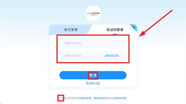 输入手机号,验证码,勾选我已阅读并同意隐私政策、服务使用协议和儿童隐私政策,点击登录即可
