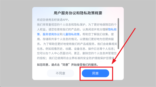 下载安装并打开言籽英语app,先同意用户服务协议和隐私政策概要