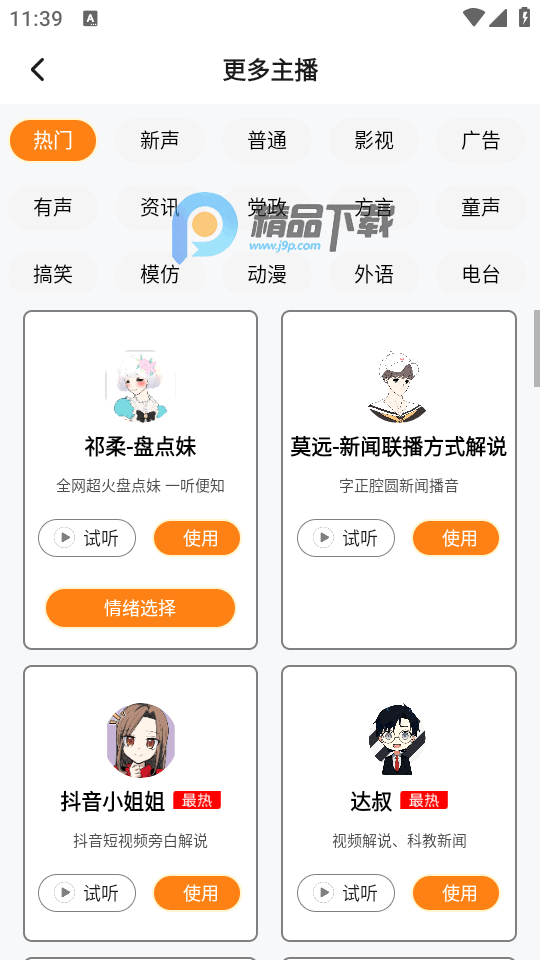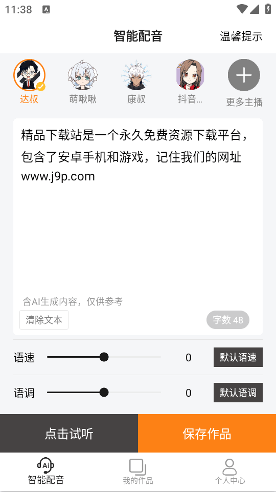 拥有超多主播的一款ai配音软件,南瓜配音app使用非常简单,界面清爽干净,可以快速生成合成配音的效果,软件没有广告,很清爽干净的体验,可以随意输入文本快速合成配音效果,需要会员才可以导出音频,如果只是听一听不导出还是不错。