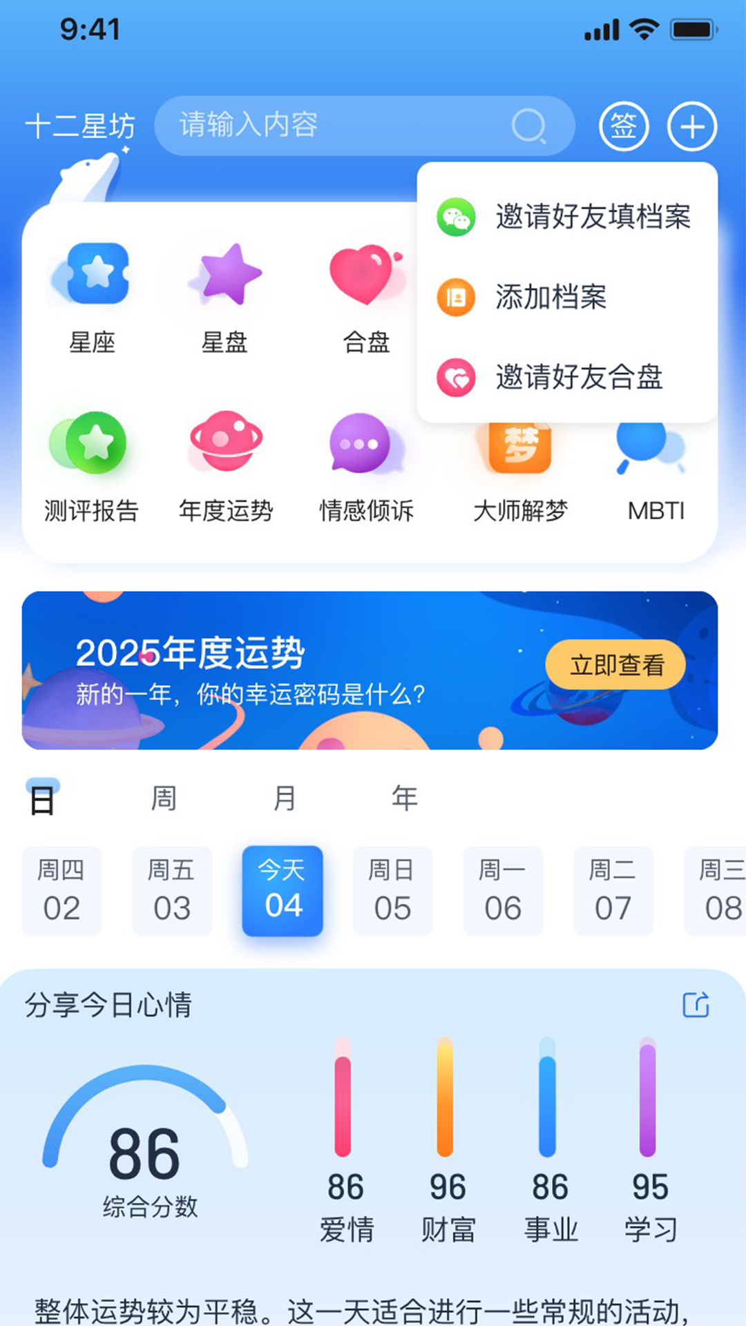 十二星坊app是一款有关星座的软件,包含星座测算、星盘测算、塔罗牌问答、骰子问答、测评报告、情感咨询、MBTI等功能,用户对什么类型的星座感兴趣的可以随时去搜索,快去下载体验吧。