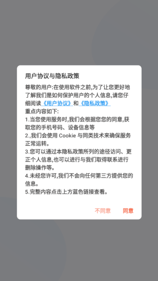 1、打开软件阅读用户协议和隐私政策,点击同意即可开始使用。