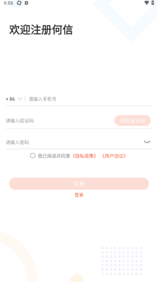 3、来到软件注册页面输入手机号、验证码、密码点击注册即可完成。