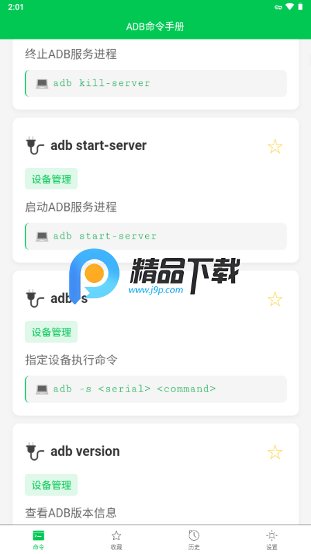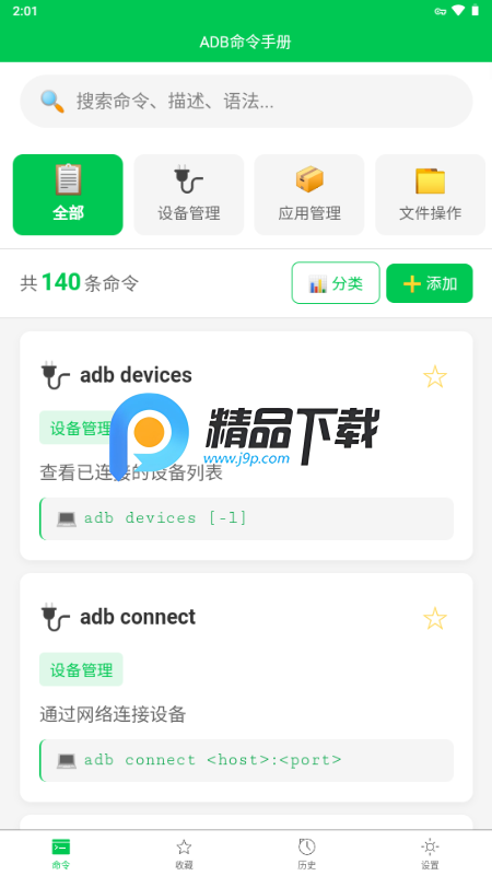 丰富命令库:收录140+条常用ADB命令,涵盖15个核心场景。