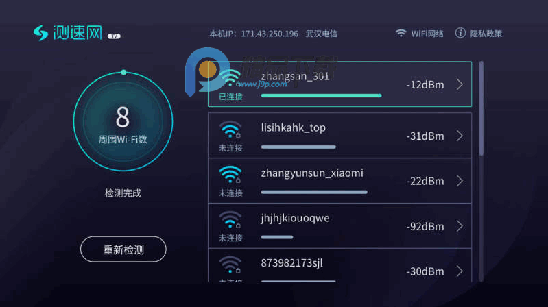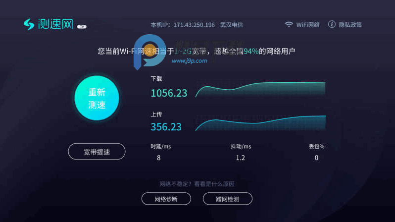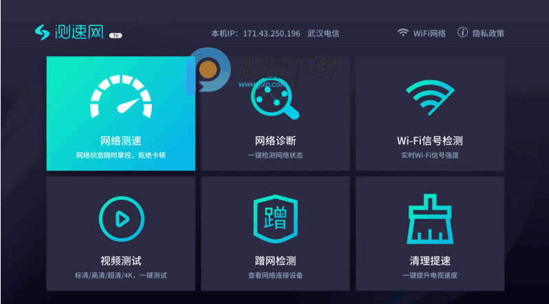 测速网官方打造的一款电视测网速的工具,测速网TV版,支持30秒一键快速测网速,查看电视上的宽带速度,wifi下载速度,上传速度,时延等内容,与电信联通合作,下载最高可以提至1000M,上传最高可提至100M,还有实用的网络安全防蹭网检测,网络诊断等功能,轻松清理加速网络的工具。