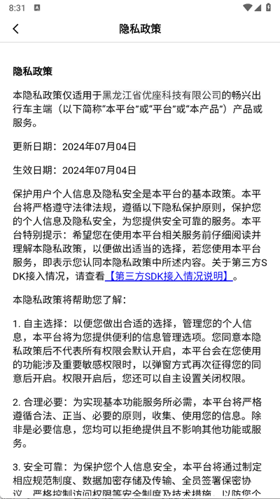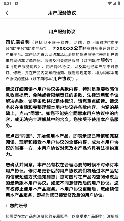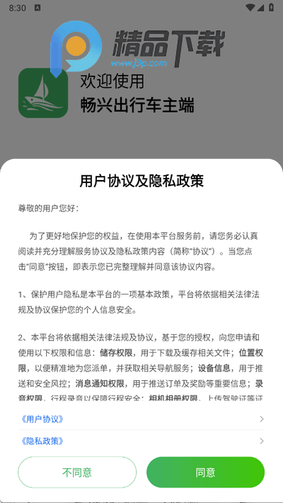 下载安装并打开畅兴出行车主端app,在用户协议及隐私政策提示界面点击同意