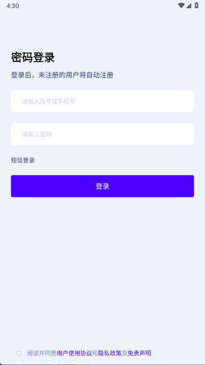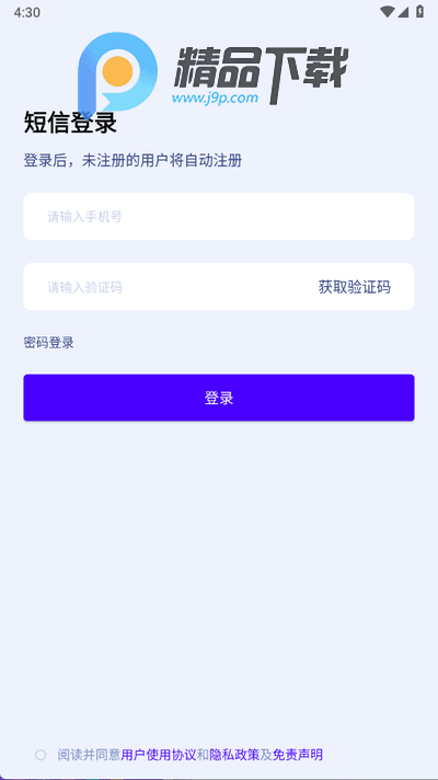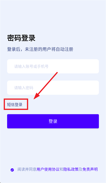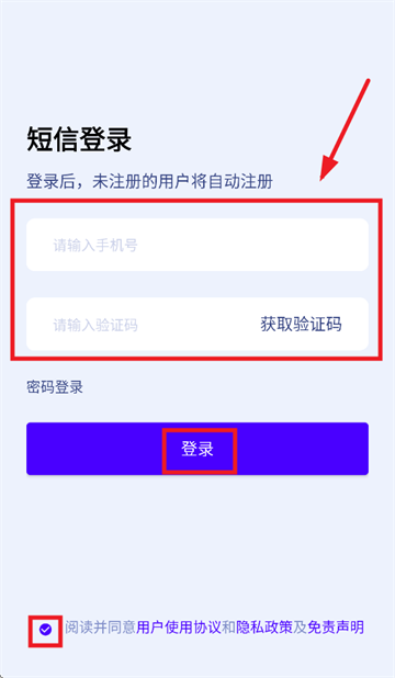 输入手机号,验证码,勾选阅读并同意用户使用协议和隐私政策及免责声明,点击登录即可