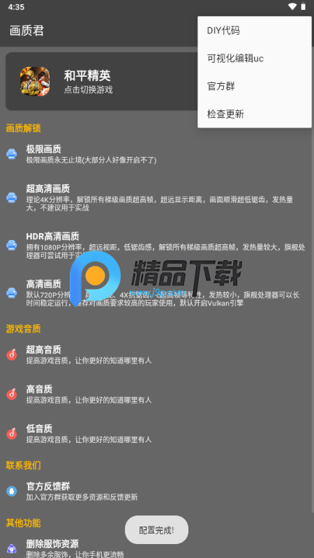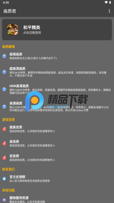 画质君是一款适用于所有机型的画质修改工具,能够帮助用户在在线游戏中获得优质的画质体验。软件提供多种免费的全新画质资源,用户可以根据自己的需求自由选择和修改游戏画质,满足不同手机的画质需求。需要修改手机游戏画质的可选择这个软件。